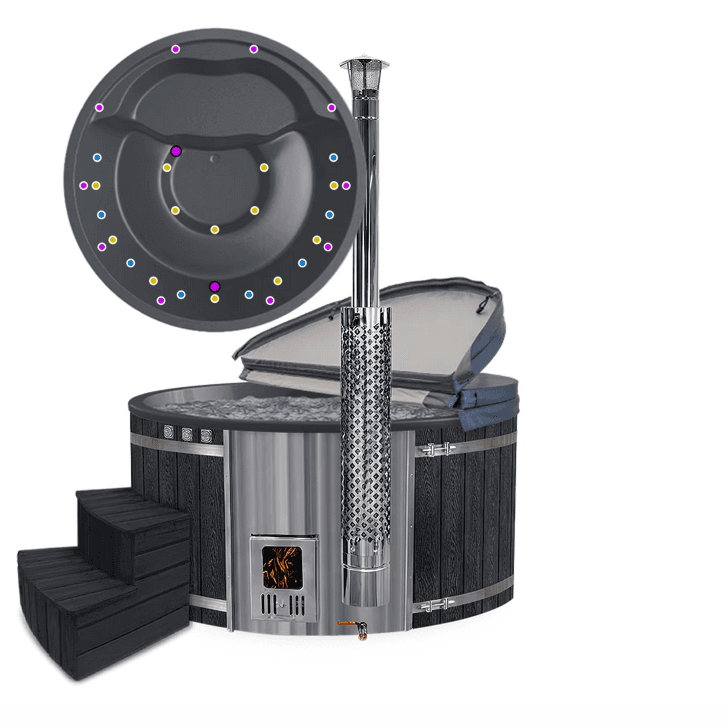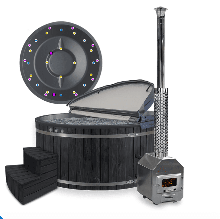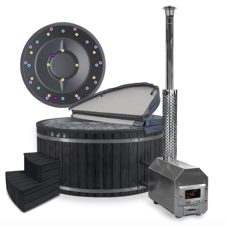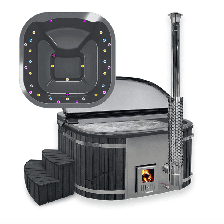 Fiberglaswanne, Thermoholzverkleidung, Holzofen aus Edelstahl