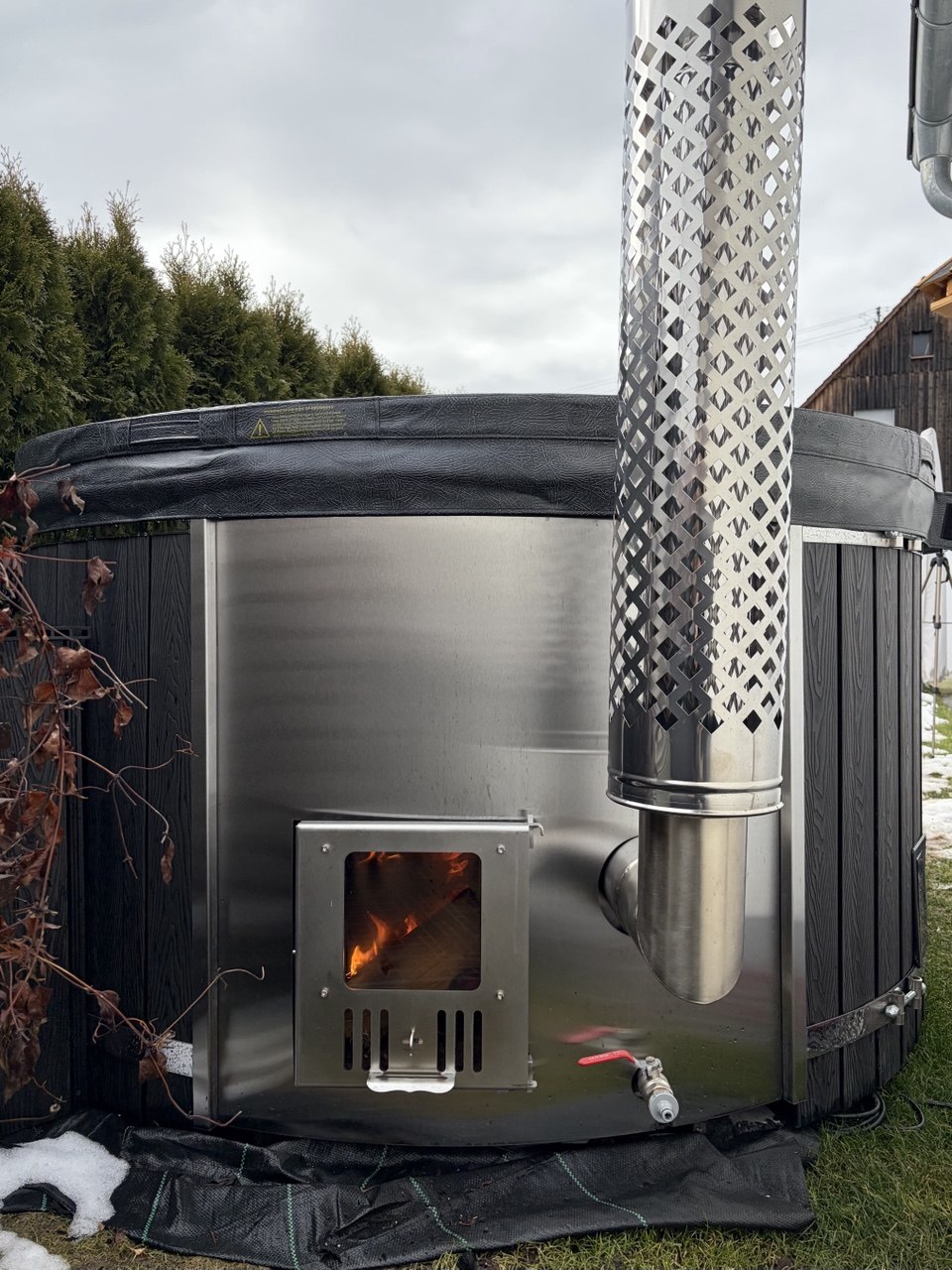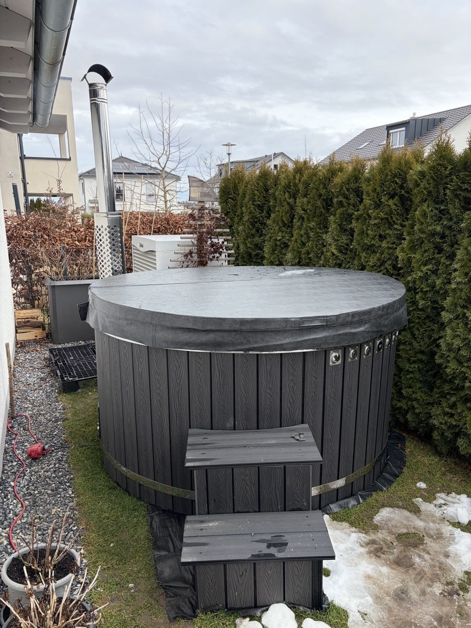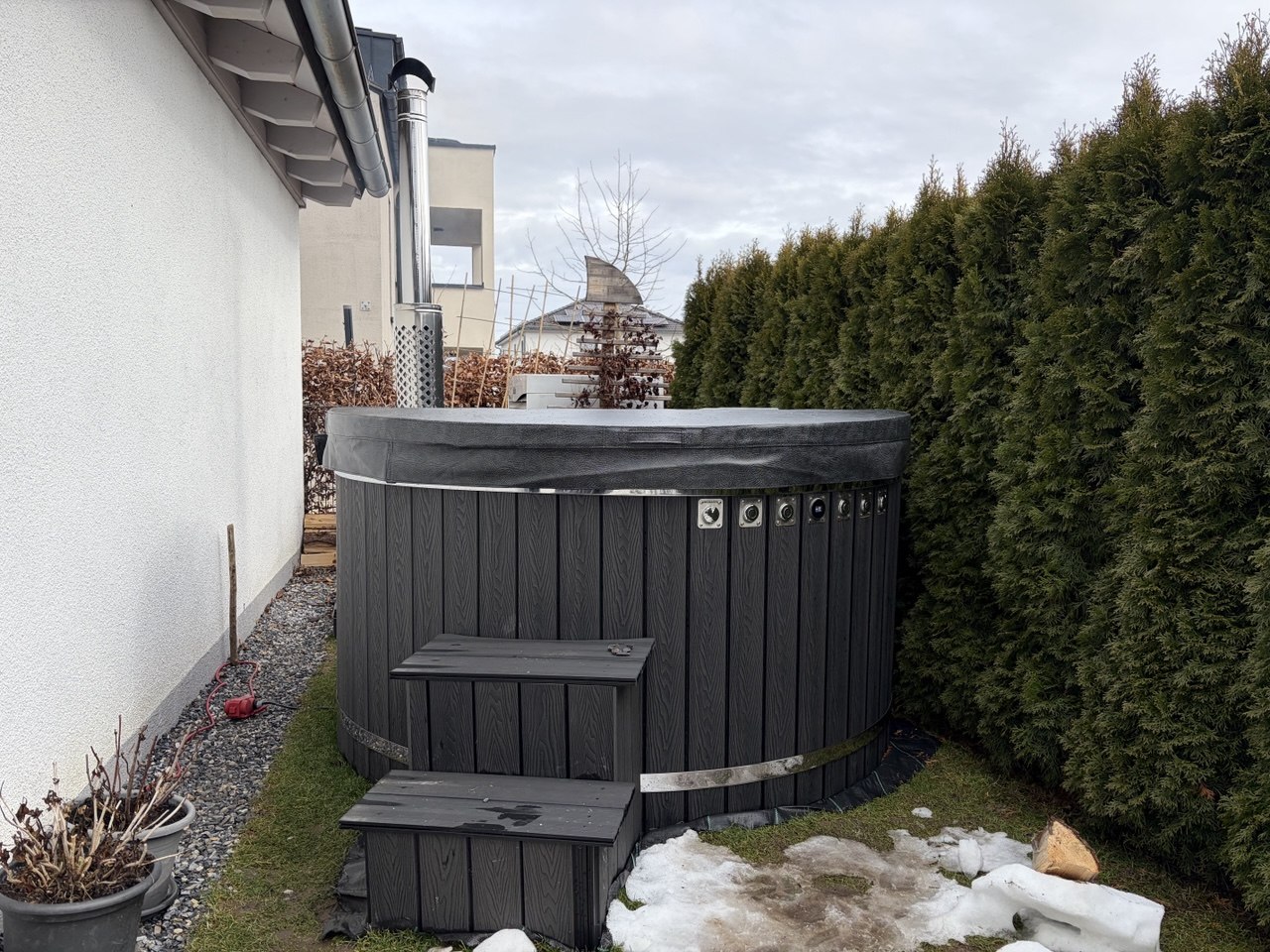 Kompakter Hot Tub (Ø 200 cm) für 4–6 Personen – ideal für entspannte Abende im Garten. Ausgestattet mit Innenofen, 8 Hydromassage- und 12 Luftmassagedüsen sowie LED-Beleuchtung (2 große + 10 kleine). Innenfarbe: Schiefergrau. Inklusive Abdeckung, Filteranschlüssen und gebogene verkleidete Stufen für maximalen Komfort.