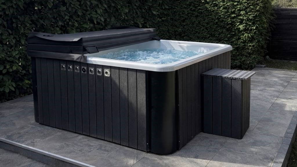 Quadratischer Hot Tub Pro (220×220 cm) für bis zu 8 Personen – ideal für gesellige Abende mit Familie und Freunden. Ausgestattet mit Innenofen, 8 Hydromassage- und 12 Luftmassagedüsen sowie LED-Beleuchtung (2 große + 10 kleine). Innenfarbe: Schiefergrau. Inklusive Abdeckung, Filteranschlüssen und gebogene verkleidete Stufen für maximalen Komfort.